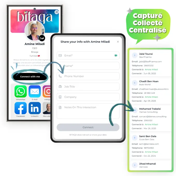 Cartes de visite digitales NFC avec capture de prospects automatisée et analytics temps réel. Rejoignez les 120+ entreprises qui ont déjà optimisé leur networking avec Bitaqa.